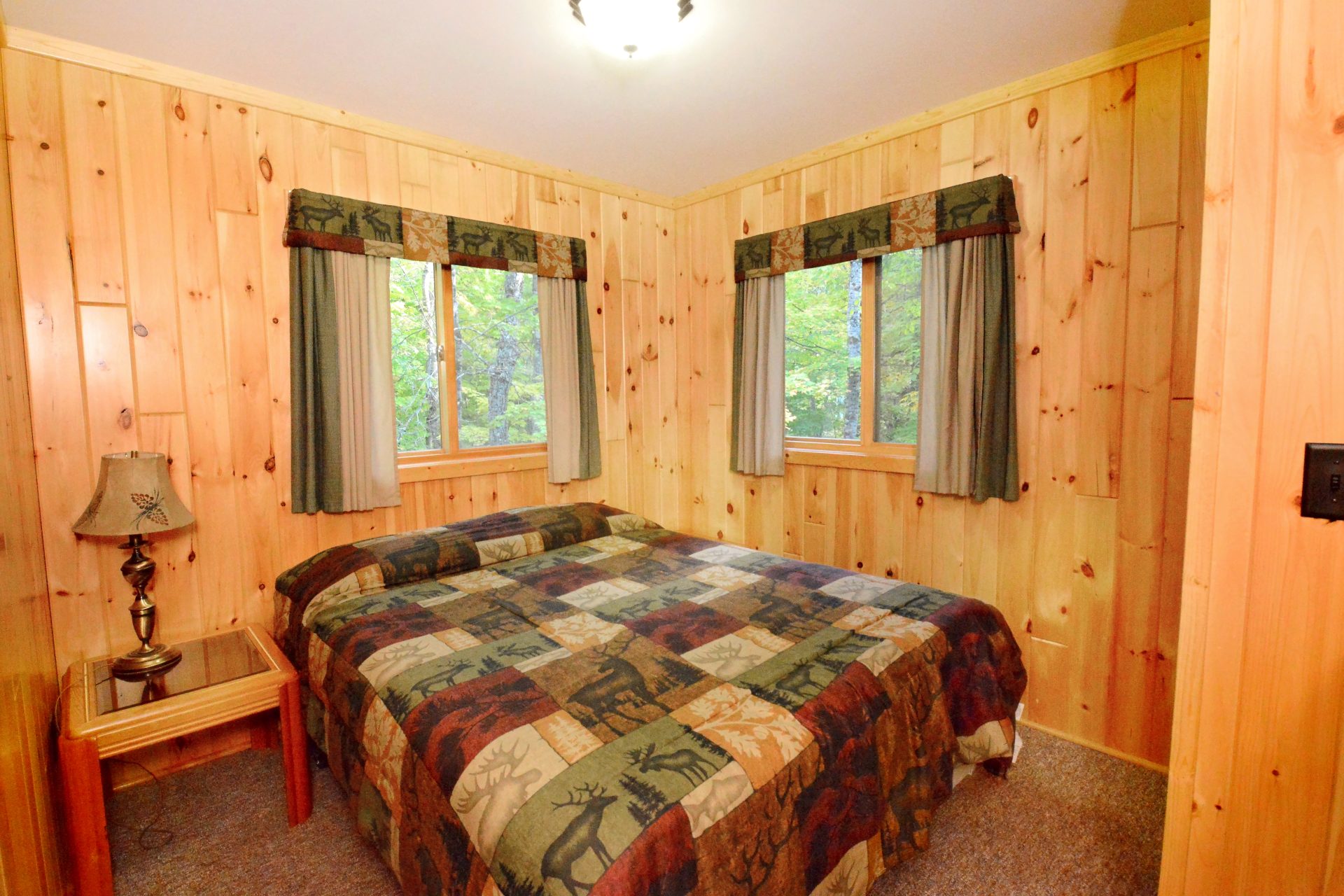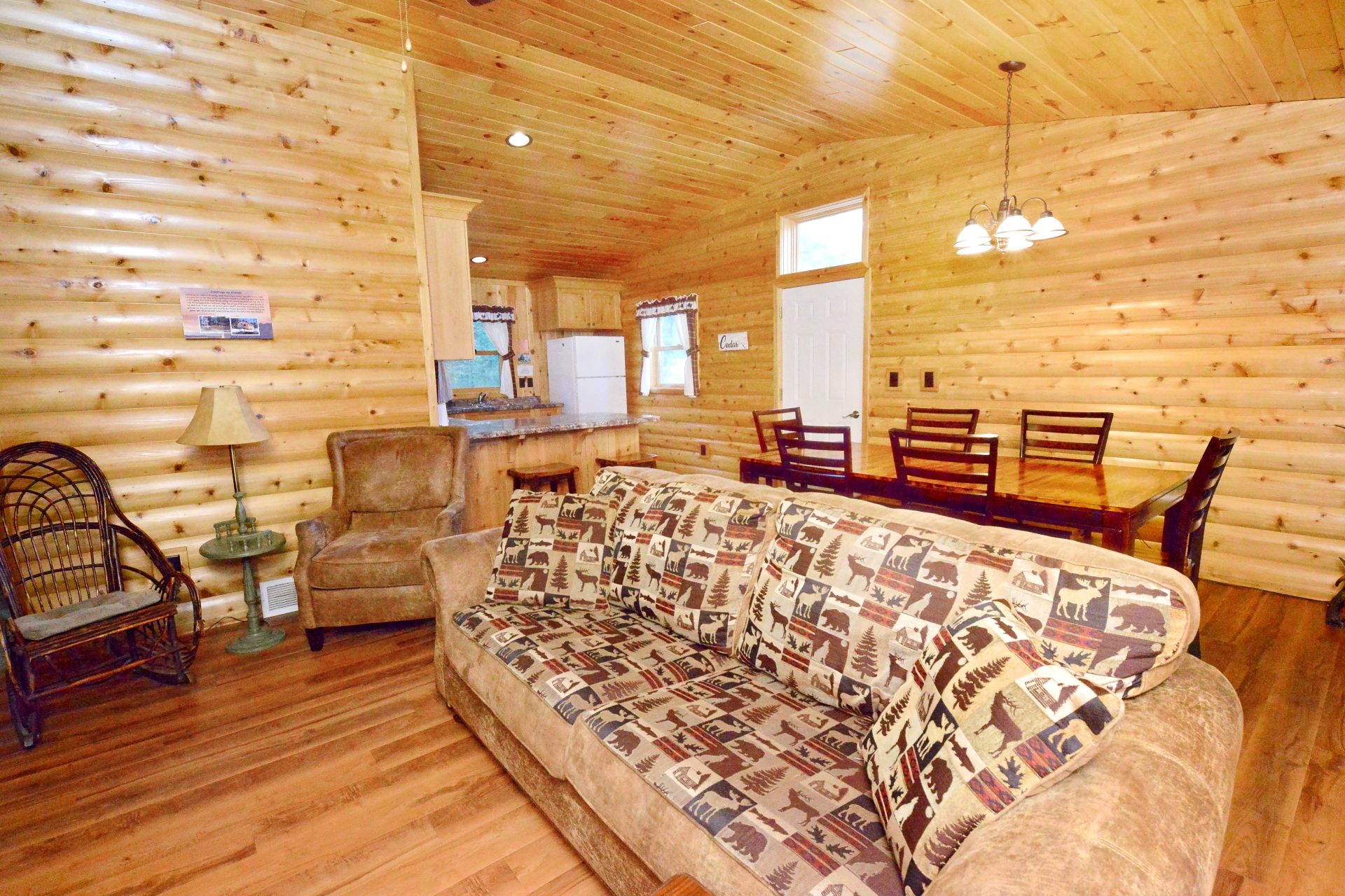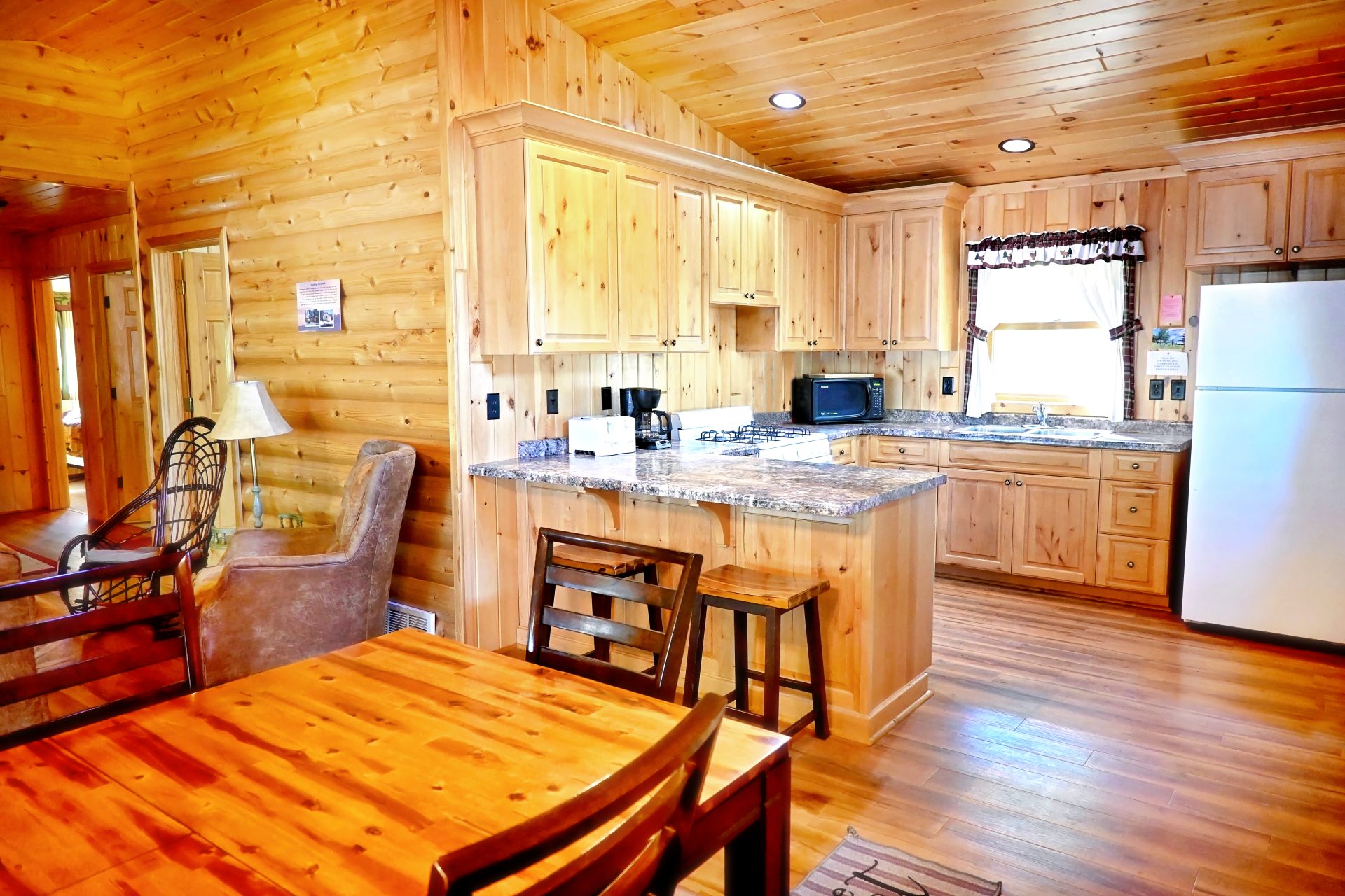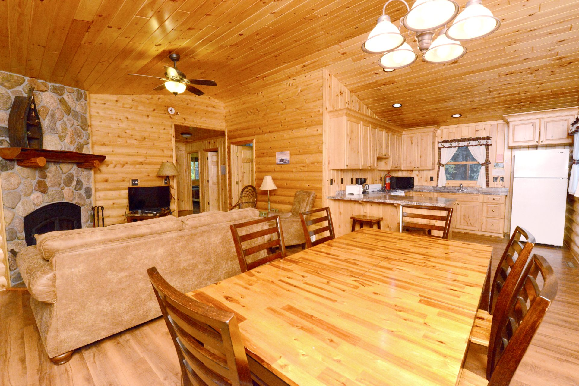 Enjoy this newly built cabin accented with cedar log walls, a stone fireplace, cathedral ceilings and double patio doors framing a serene view of Lost Land Lake (one of the Quiet Lakes). Cedar is equipped with a large screened-in porch just 75′ from the water’s edge providing easy access to your private dock. Central heating and air will keep this treasure at the perfect temperature for spring, summer and fall. Our first pet-free cabin offers three spacious bedrooms, two baths and a cozy kitchen. A centrally located snack bar adjacent to a large dining and living room area, keeps the family together in one communal area. The location of this delightful gem offers a perfect balance of interaction and relaxation.