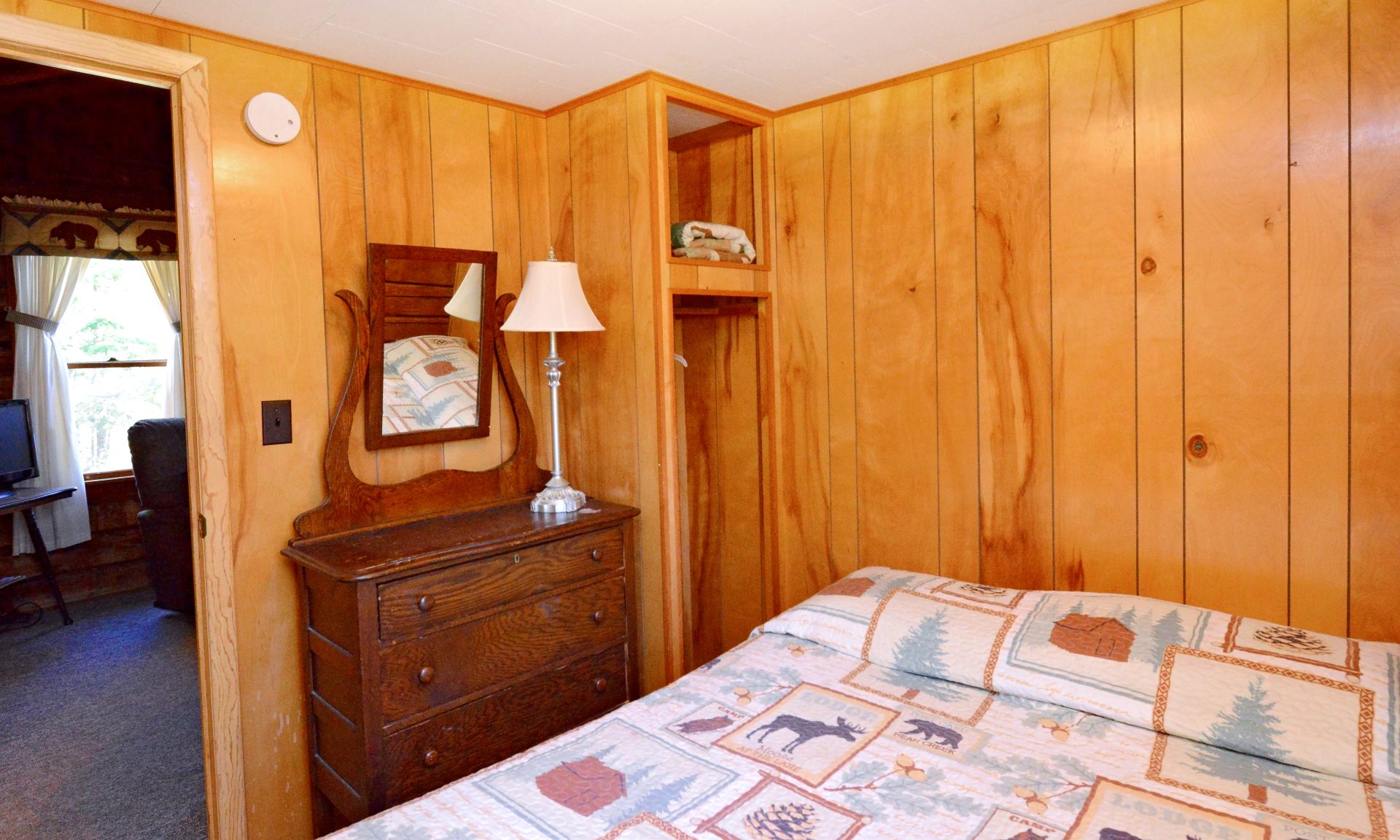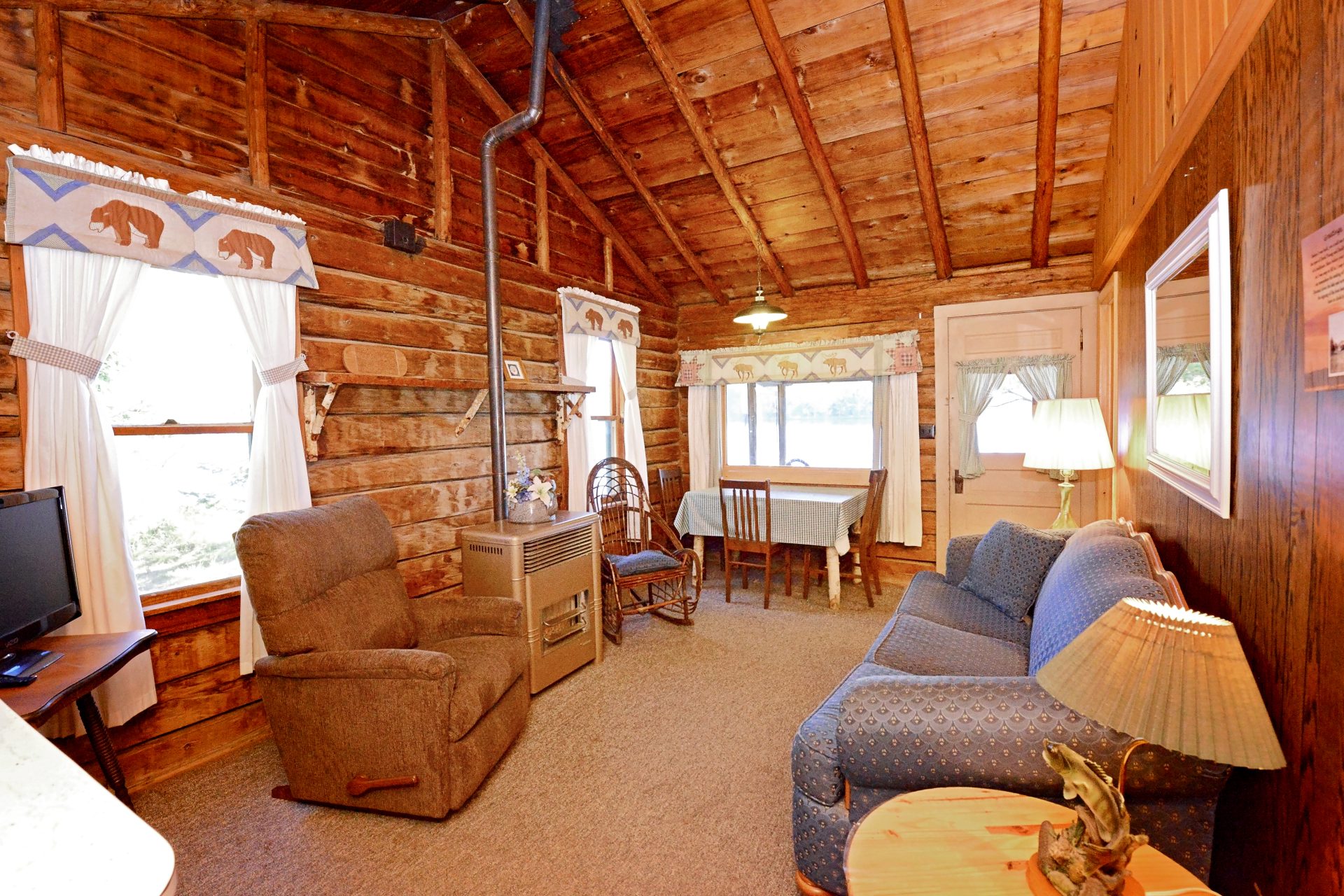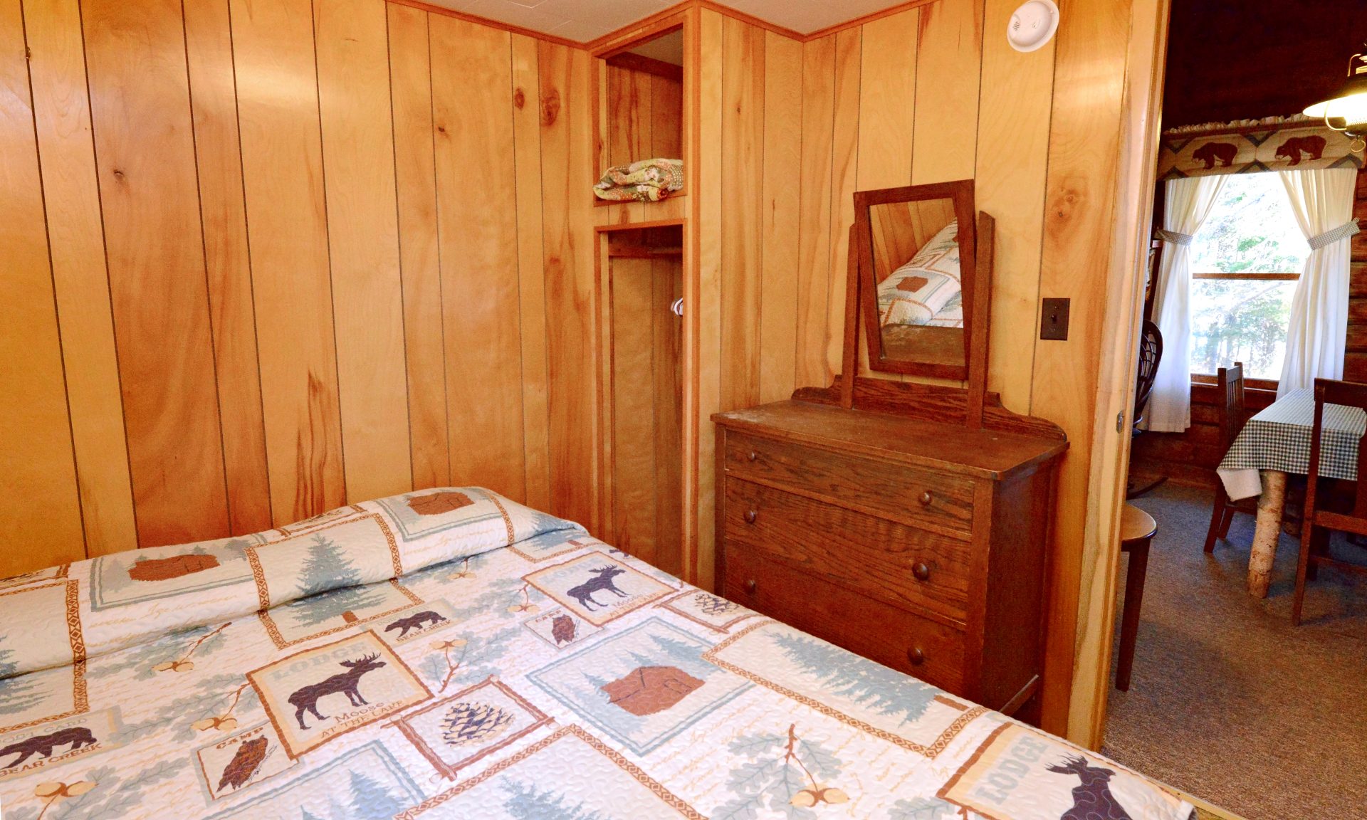 Blessed with grandma’s antiques, cathedral ceilings and a picturesque lake view, this is one our most coveted cabins. Located in our bay, Killdeer signifies an undisturbed vacation with only 10 level feet from water’s edge. Enjoy a front row seat from 2 sides to nature’s water theatre from your spacious screened-in porch or simply enjoy the peace and tranquility of this beautiful up north log cabin.
