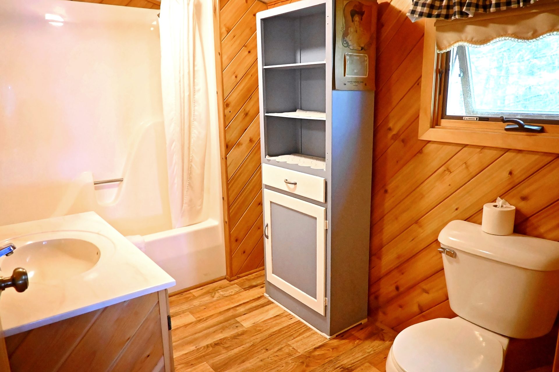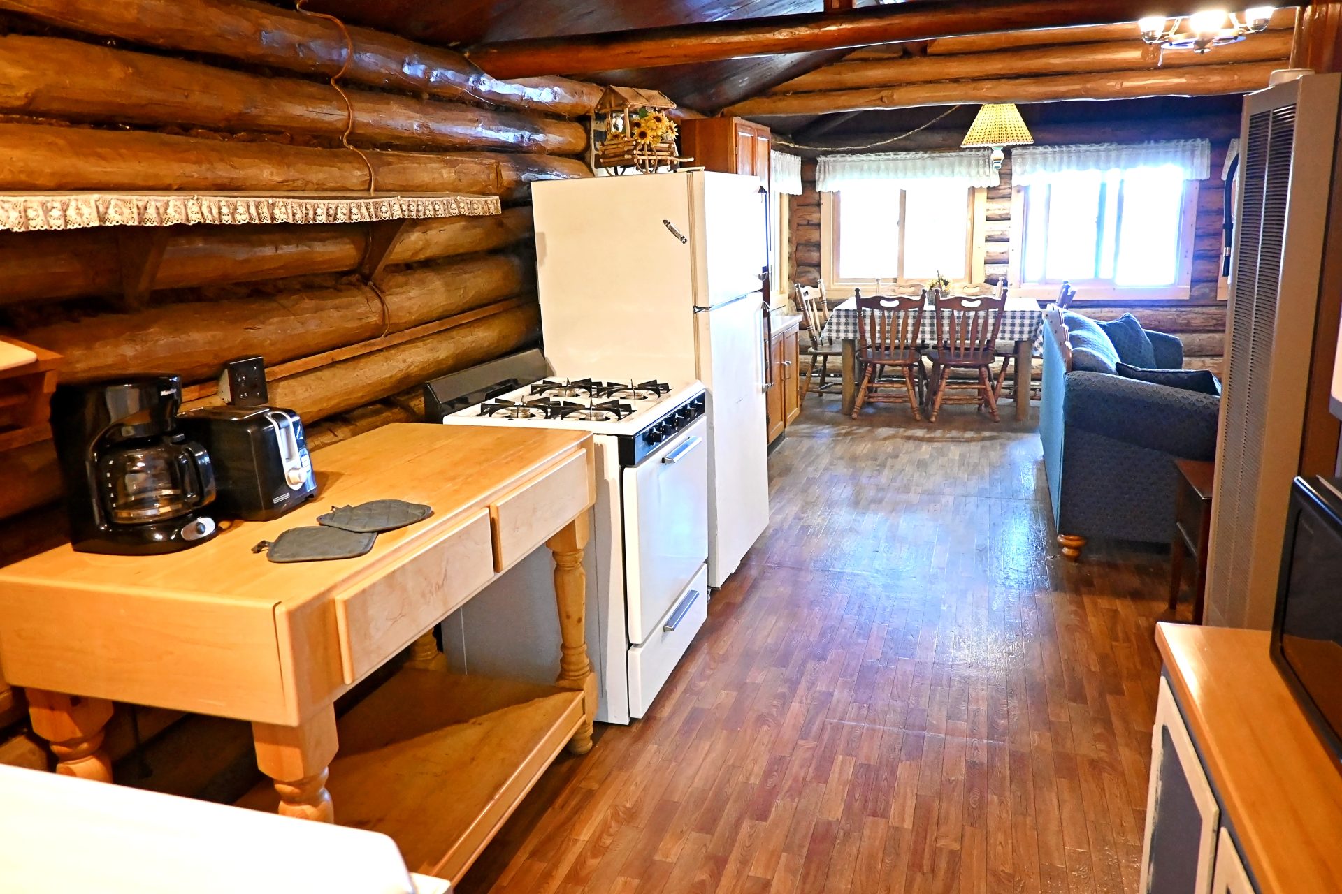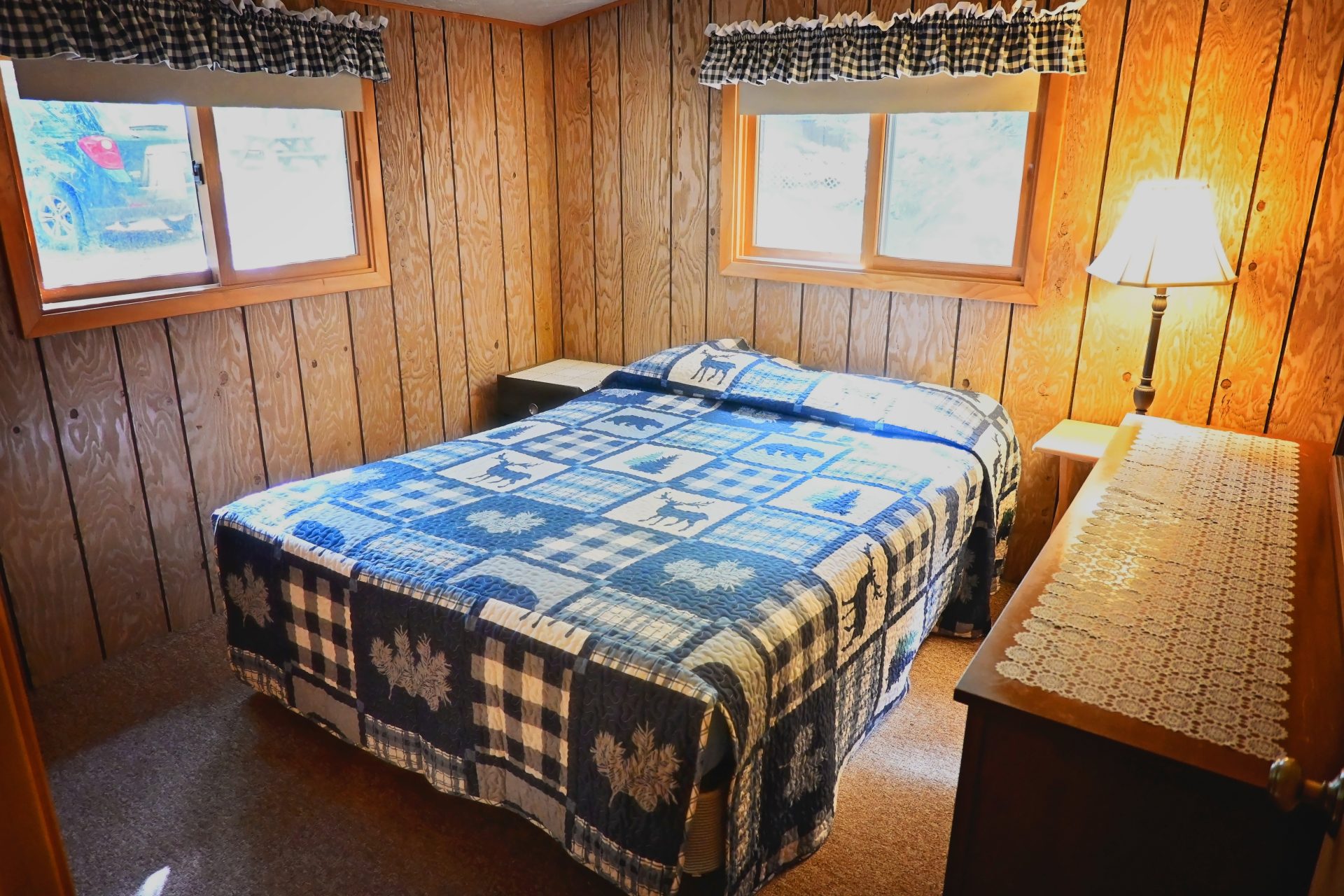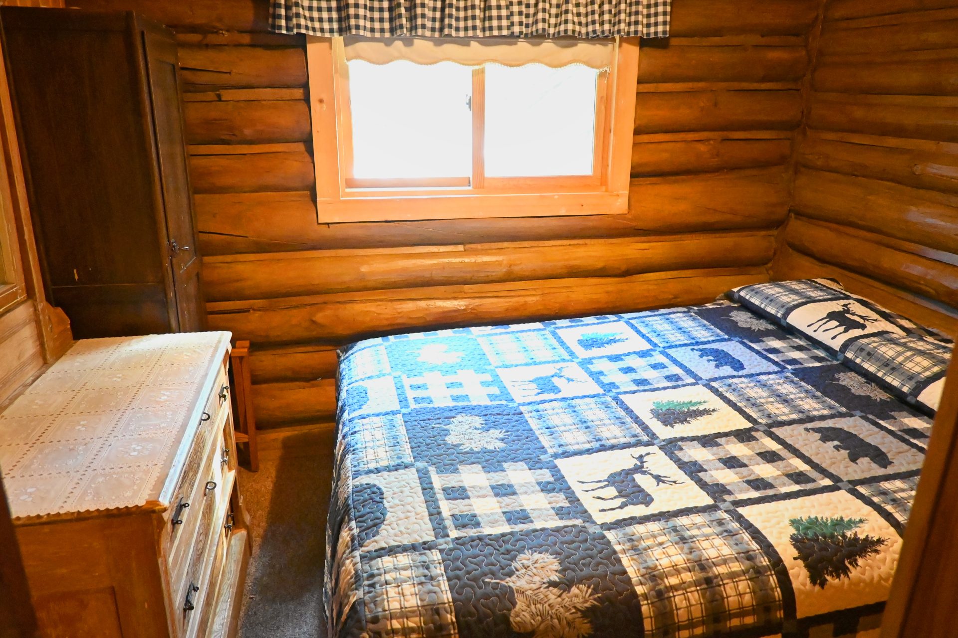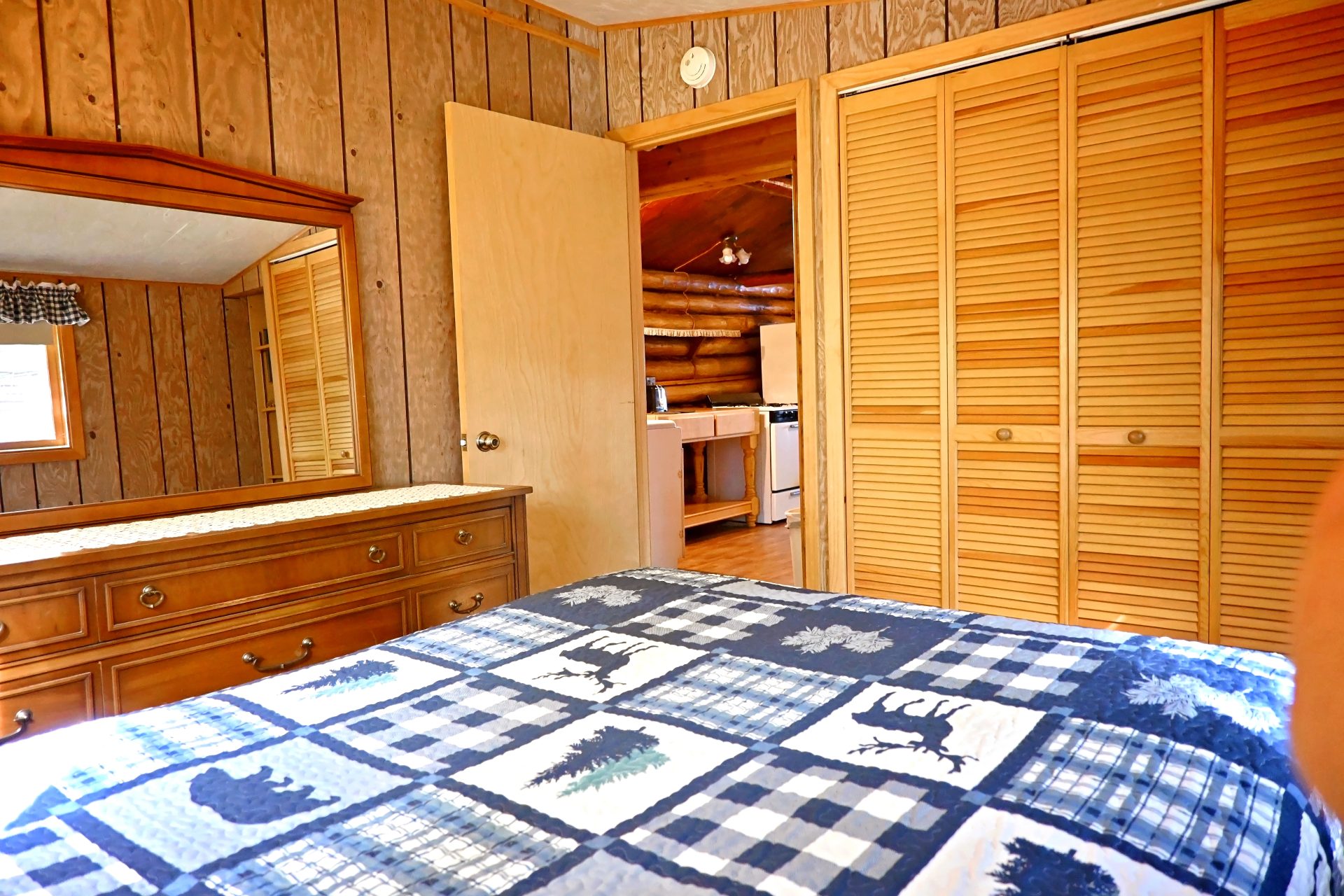 Small enough for a romantic get-a-way, yet large enough with a newly remodeled bath, cathedral ceilings in dining and living room with Satellite TV and large kitchen for family and friends. This romantic and quaint log cabin sets a romantic mood for honeymooners with a stone fire place. With windows along the entire front, savor an excellent lake view from this elevated position. Fifteen steps down to the water, takes you to a sandy beach and safe swimming area with electricity at your private dock. Only ½ mile from the resort, perfect for a secluded get-away.